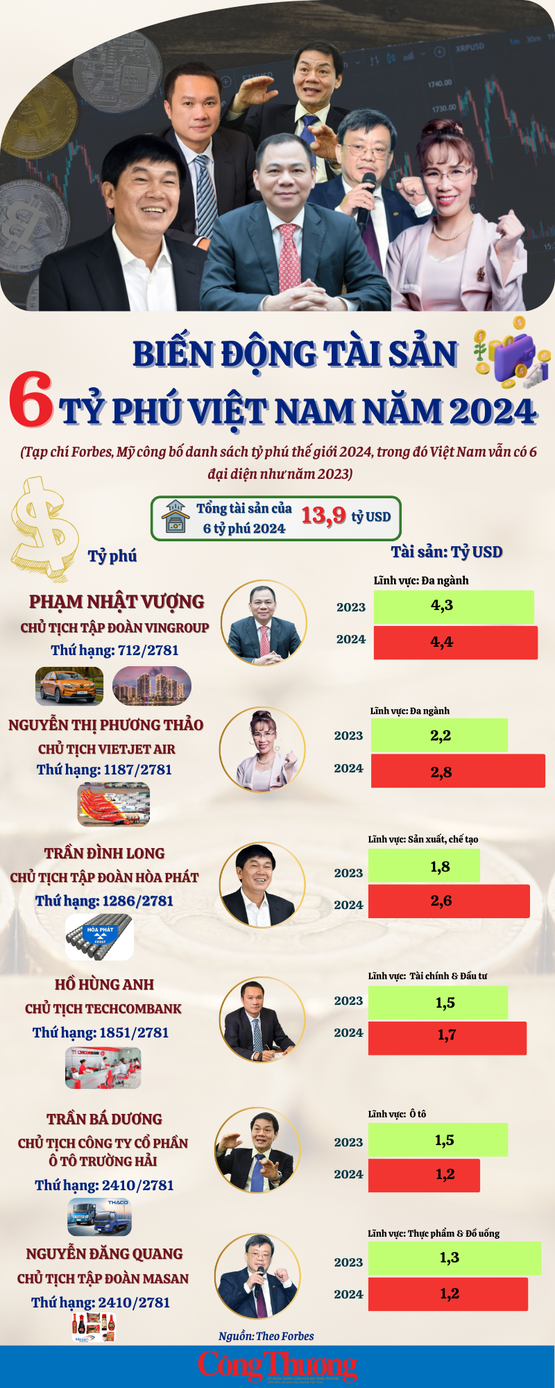 Danh sách tỷ phú USD của Việt Nam năm 2024 gồm: Chủ tịch Tập đoàn Vingroup Phạm Nhật Vượng; Chủ tịch VietJet Air Nguyễn Thị Phương Thảo; Chủ tịch Tập đoàn Hòa Phát Trần Đình Long; Chủ tịch Techcombank Hồ Hùng Anh; Chủ tịch Công ty Cổ phần ô tô Trường Hải (Thaco) Trần Bá Dương và Chủ tịch Tập đoàn Masan Nguyễn Đăng Quang.