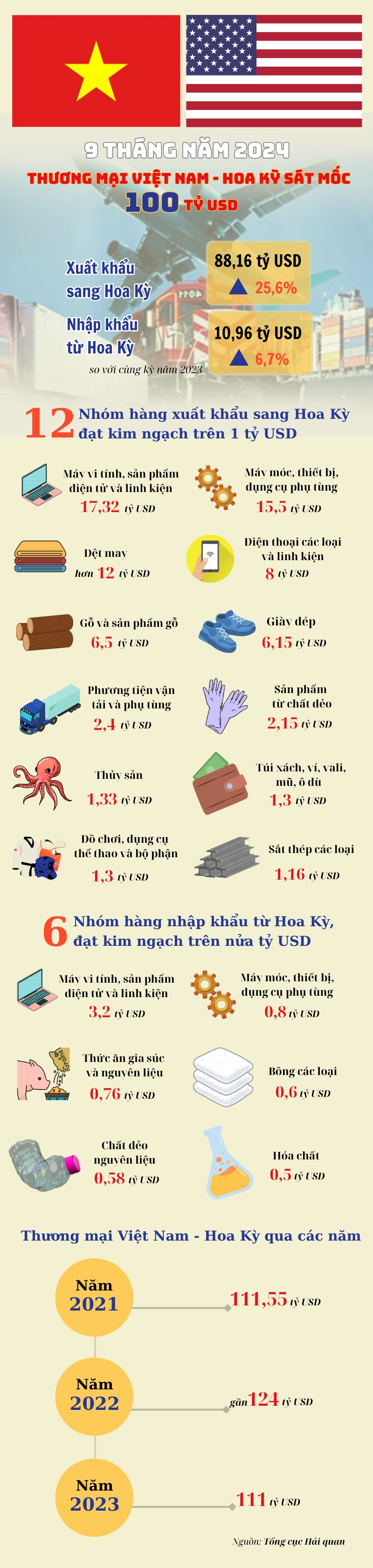 Với tổng kim ngạch đạt 99,12 tỷ USD trong 9 tháng qua, có thể khẳng định năm 2024 xuất nhập khẩu Việt Nam – Hoa Kỳ sẽ đạt và vượt mốc 100 tỷ USD.