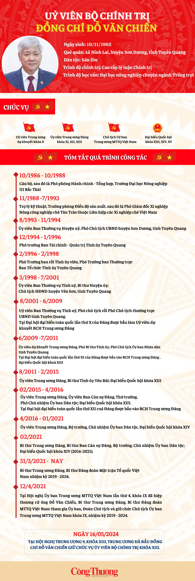 Tại Hội nghị Trung ương 9, Ban Chấp hành Trung ương Đảng bầu bổ sung 4 Ủy viên Bộ Chính trị khoá XIII, trong đó có đồng chí Đỗ Văn Chiến, Bí thư Trung ương Đảng, Bí thư Đảng đoàn, Chủ tịch Uỷ ban Trung ương Mặt trận Tổ quốc Việt Nam.