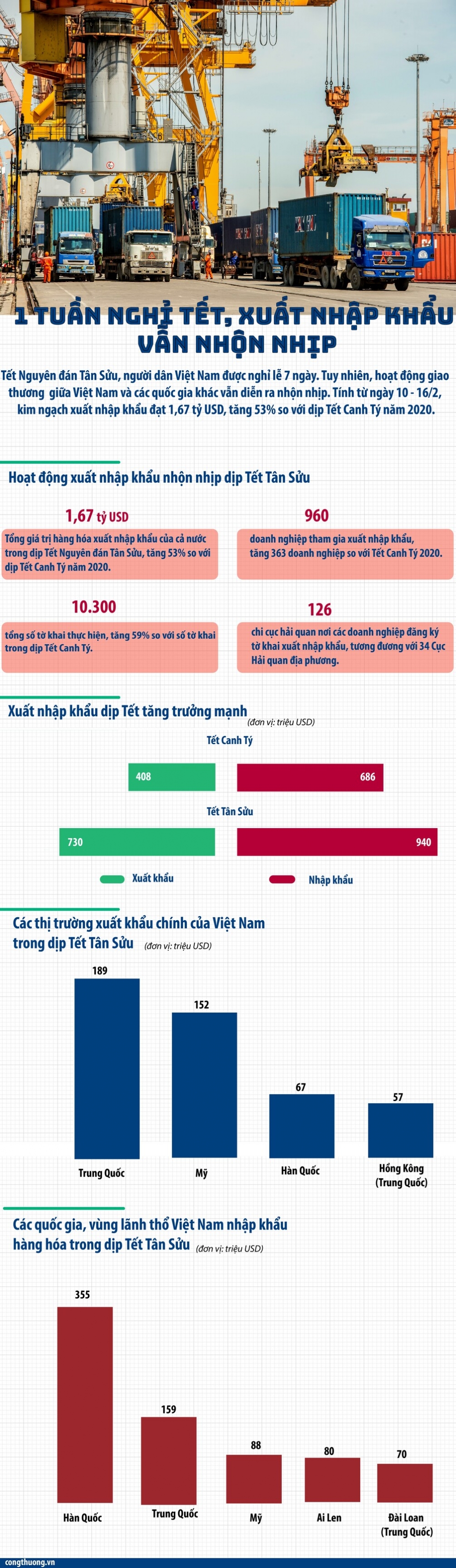 Tết Nguyên đán Tân Sửu, người dân Việt Nam được nghỉ lễ 7 ngày. Tuy nhiên, hoạt động giao thương giữa Việt Nam và các quốc gia khác vẫn diễn ra nhộn nhịp. Tính từ ngày 10 – 16/2, kim ngạch xuất nhập khẩu đạt 1,67 tỷ USD, tăng 53% so với dịp Tết Canh Tý năm 2020.