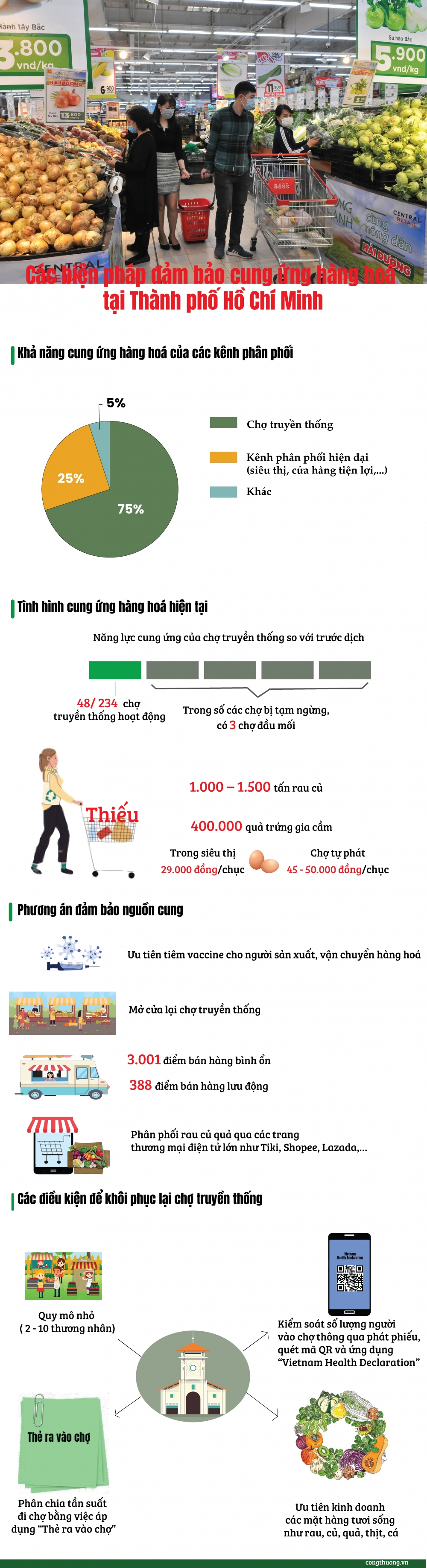 Sau 10 ngày giãn cách toàn TP Hồ Chí Minh theo chỉ thị 16 của Thủ tướng chính phủ, cung ứng hàng hoá đủ cho người dân vẫn là một vấn đề được đặc biệt quan tâm.. Sở Công Thương TP Hồ Chí Minh đã đưa ra các biện pháp mới, thích ứng với tình hình của thành phố. Trong đó, đáng chú ý là quyết định mở thí điểm lại chợ truyền thống.