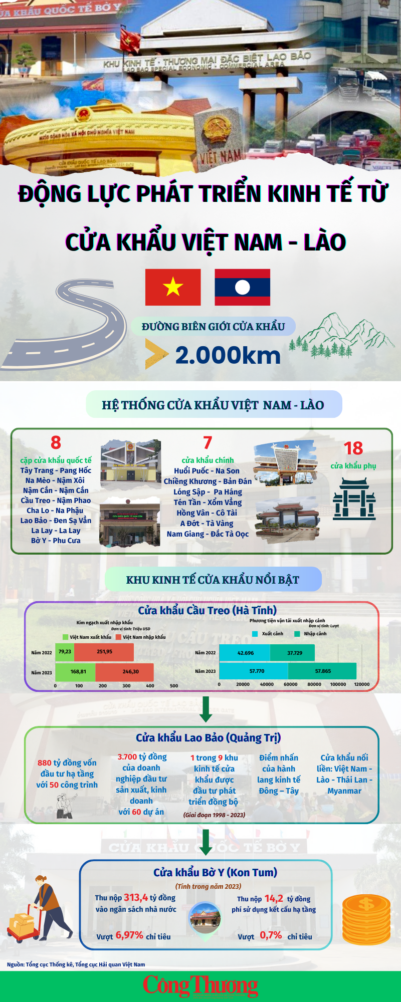 Hệ thống cửa khẩu dọc biên giới Việt Nam - Lào dài hơn 2.000km, bao gồm 8 cặp cửa khẩu quốc tế, 7 cửa khẩu chính và 18 cửa khẩu phụ, đã góp phần thúc đẩy mạnh mẽ hoạt động thương mại và dịch vụ. Trong đó có thể kể đến một số cửa khẩu và khu kinh tế cửa khẩu nổi bật như Lao Bảo, Cầu Treo và Bờ Y.