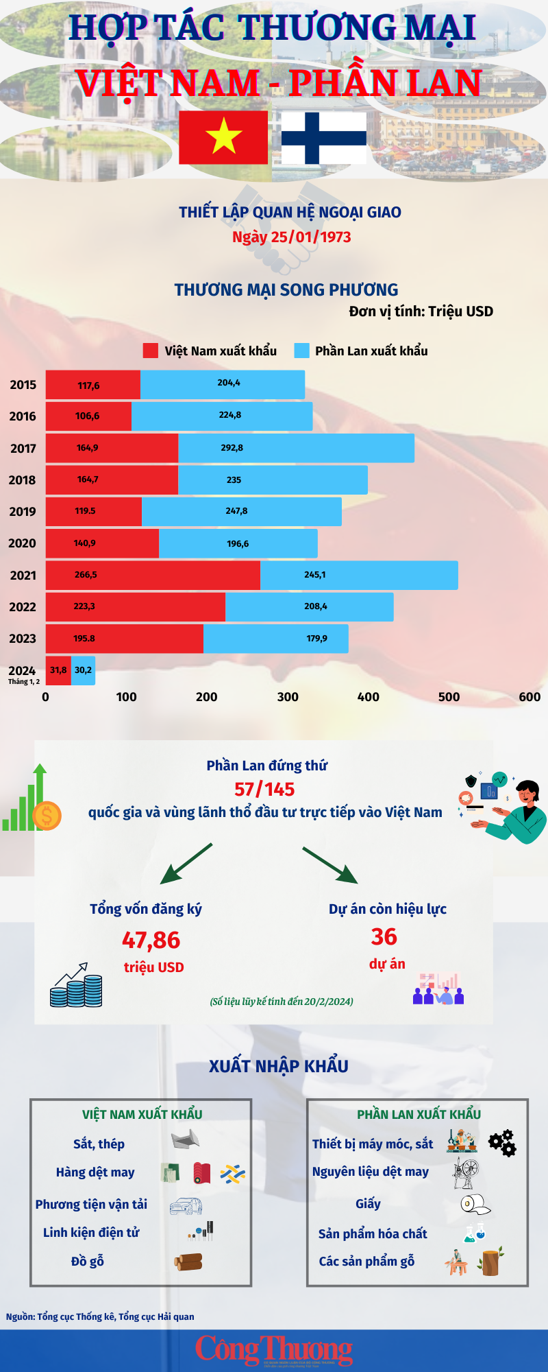Việt Nam là đối tác thương mại quan trọng nhất của Phần Lan ở khu vực Đông Nam Á. Kim ngạch thương mại hai chiều Việt Nam và Phần Lan năm 2023 đạt trên 375 triệu USD; trong 2 tháng đầu năm 2024 đạt trên 62 triệu USD. Hai bên còn nhiều tiềm năng hợp tác trong các lĩnh vực như: Năng lượng, lâm nghiệp, công nghệ thông tin…