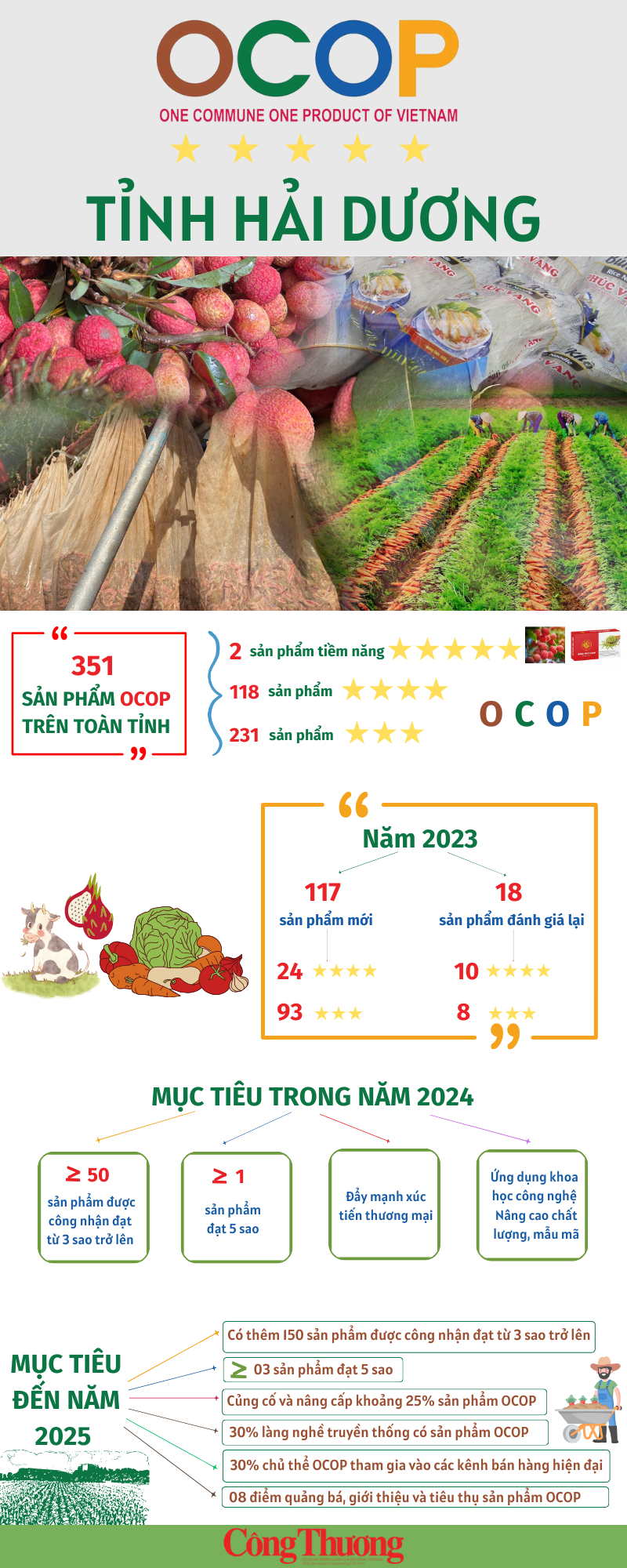 Theo số liệu thống kê của Sở Nông nghiệp và Phát triển nông thôn tỉnh Hải Dương, tính đến nay, toàn tỉnh có 351 sản phẩm OCOP (bao gồm 118 sản phẩm OCOP 4 sao, 231 sản phẩm OCOP 3 sao). Đặc biệt, tỉnh có 2 sản phẩm tiềm năng 5 sao là bánh đậu xanh rồng vàng Hoàng Gia và vải tươi Queen Thanh Ha Lychee đang đề nghị Trung ương công nhận.