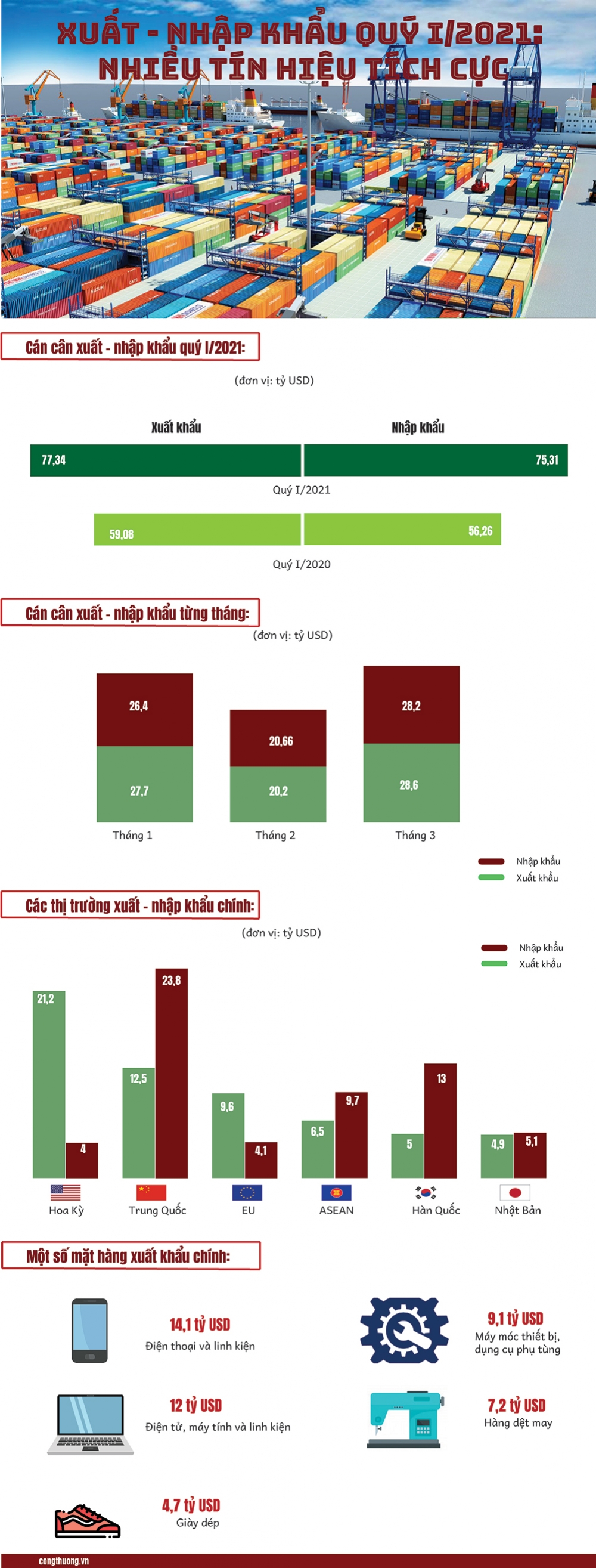 [Infographics] Xuất - nhập khẩu quý I/2021: Tín hiệu tích cực