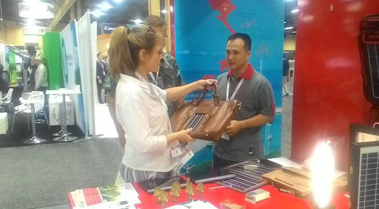| Nhân viên Công ty Cổ phần Năng lượng IREX giới thiếu với khách hàng Mỹ tại triển lãm SPI chiếc túi xách tự xạc pin bằng năng lượng mặt trời do công ty sản xuất |