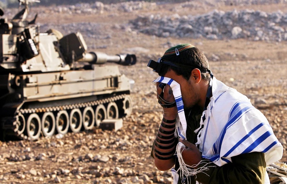 | Một binh sĩ Israel cầu nguyện bên cạnh một đơn vị pháo binh di động đóng gần thị trấn Fasuta ở phía bắc Israel. Ảnh: Reuters |