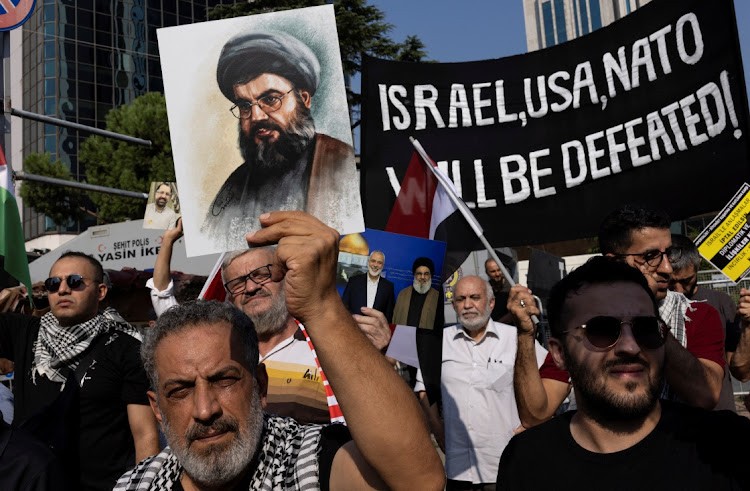 | Áp phích với hình thủ lĩnh Hezbollah Hassan Nasrallah tại một tang lễ tượng trưng ở Thổ Nhĩ Kì hôm 29/9. Ảnh: Reuters |