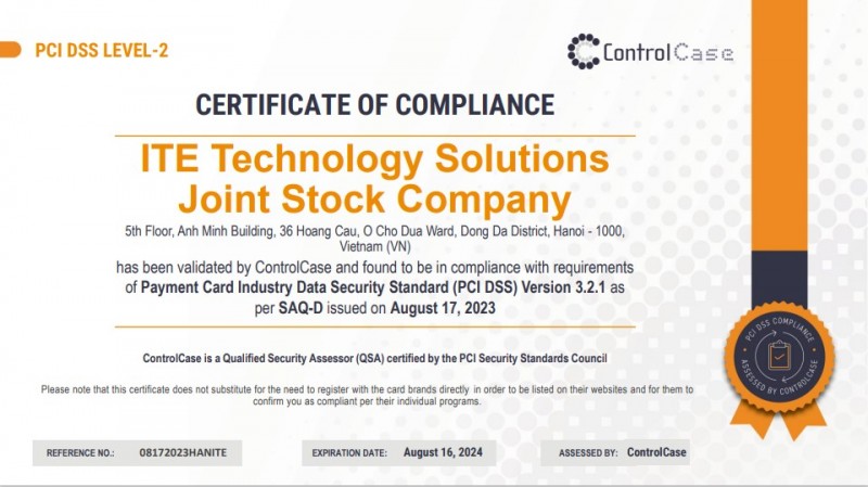 Công ty CP giải pháp công nghệ ITE (ITE) đã chính thức và vinh dự nhận được Chứng chỉ bảo mật quốc tế PCI DSS 3.2.1 level 2 – dành cho nhà cung cấp dịch vụ thanh toán (Service Provider) do Tổ chức đánh giá Quốc tế ControlCase trao tặng.