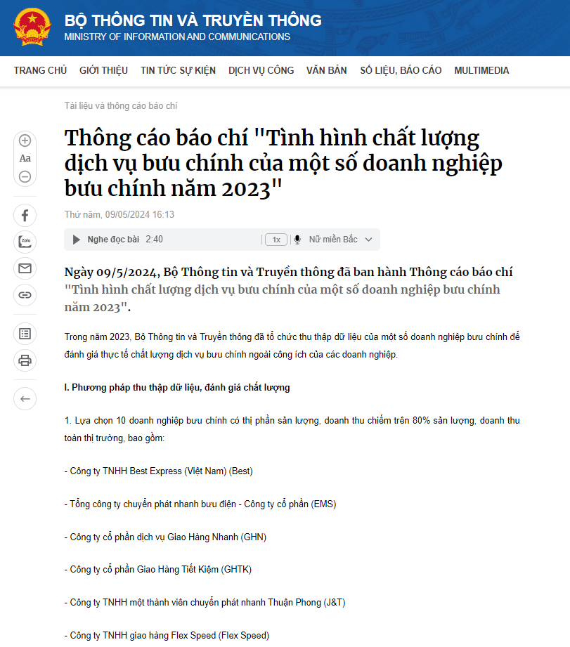 | Thông cáo báo chí "Tình hình chất lượng dịch vụ bưu chính của một số doanh nghiệp bưu chính năm 2023". Nguồn: Bộ Thông tin và Truyền thông |