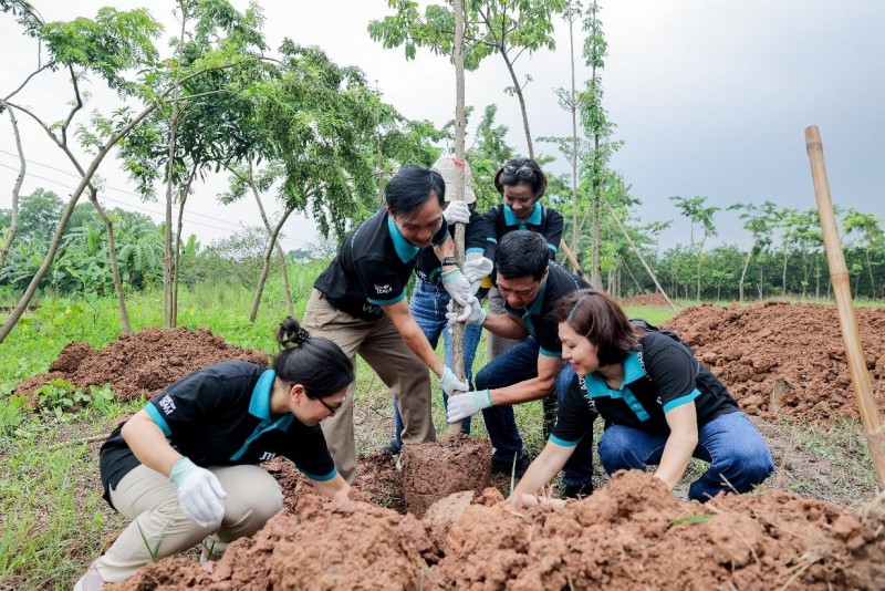 | Nhân viên JTI Việt Nam góp sức vun đất cho 100 gốc cây Bàng Đài Loan tại xã Cát Quế, huyện Hoài Đức, Hà Nội. |