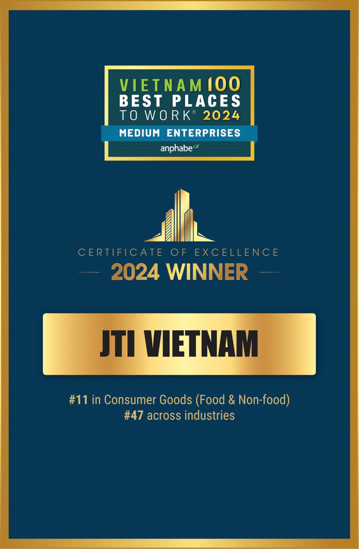 Năm nay, công ty đã vươn 6 bậc so với 2023, lên vị trí thứ 11 trong ngành hàng tiêu dùng nhanh (FMCG) khối doanh nghiệp vừa, một bước tiến vượt bậc đánh dấu thành tựu đáng kể trong lĩnh vực đầy cạnh tranh này. Trên quy mô toàn quốc, JTI cũng đã đạt vị trí thứ 47, tăng 17 bậc, trong bảng xếp hạng tổng thể cho các doanh nghiệp vừa, nâng tầm thương hiệu với môi trường làm việc, nơi làm việc danh giá trên thị trường.
