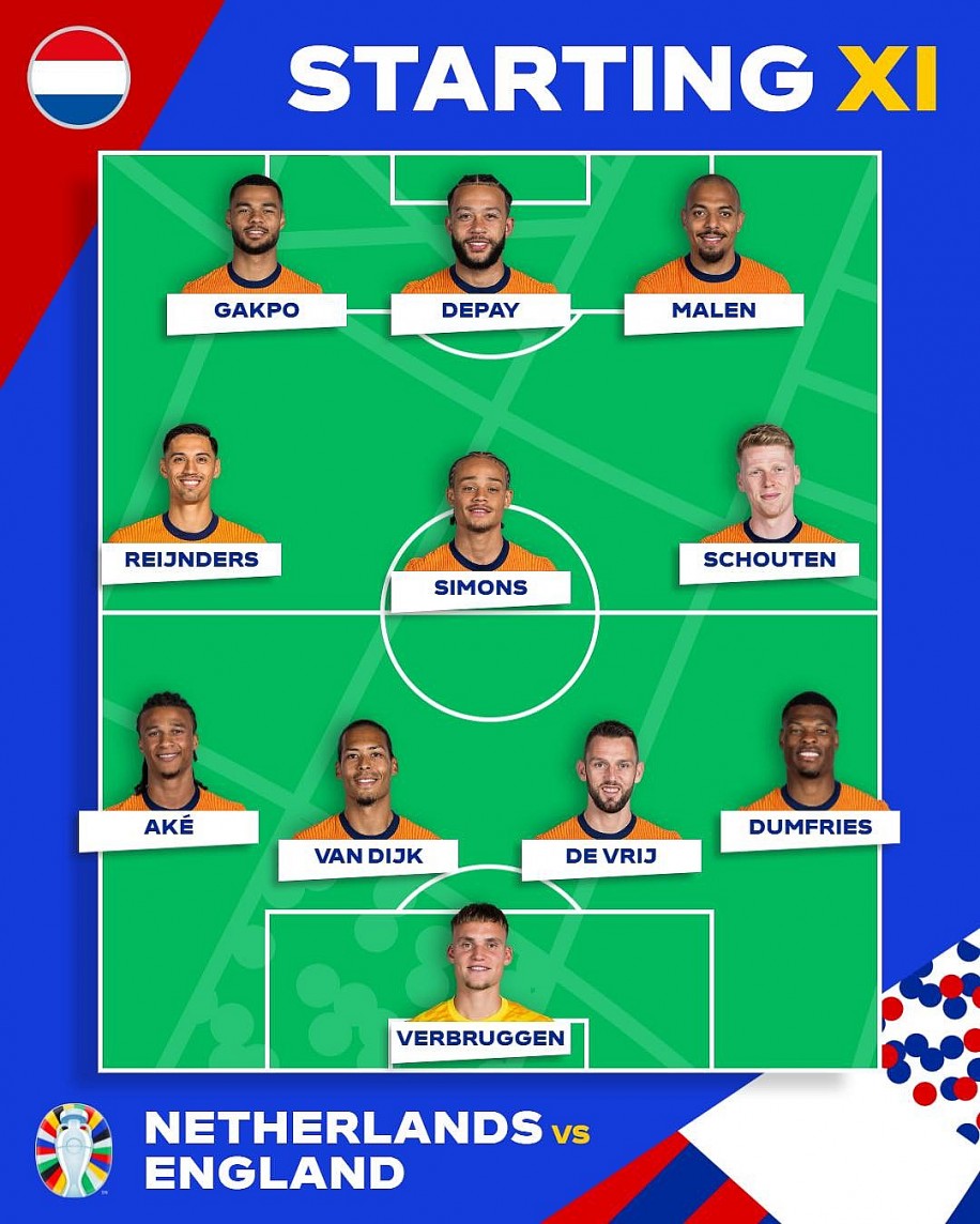 Đội tuyển Anh chỉ có một sự thay đổi trong 11 cái tên đá chính khi trung vệ Marc Guehi trở lại sau án treo giò và ra sân ngay từ đầu. Bên phía đối diện, Hà Lan cũng chỉ có một sự thay đổi khi khi Donyell Malen xuất phát từ đầu thay Steven Bergwijn.