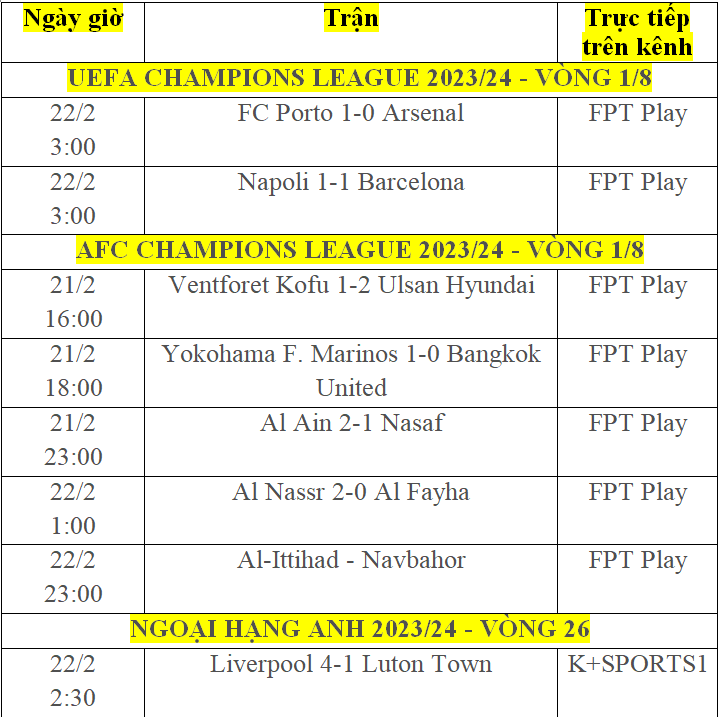 | Kết quả bóng đá của các trận đấu trên sân cỏ châu Âu, châu Á ngày 21/2, rạng sáng ngày 22/2. |