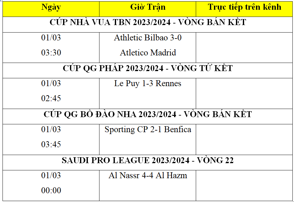 | Kết quả bóng đá ngày 29/2: MU vào tứ kết FA Cup, Thép Xanh Nam Định thắng không tưởngLịch thi đấu bóng đá hôm nay 29/2: Bilbao và Atletico tranh vé chung kết Cúp Nhà vua Tây Ban Nha |