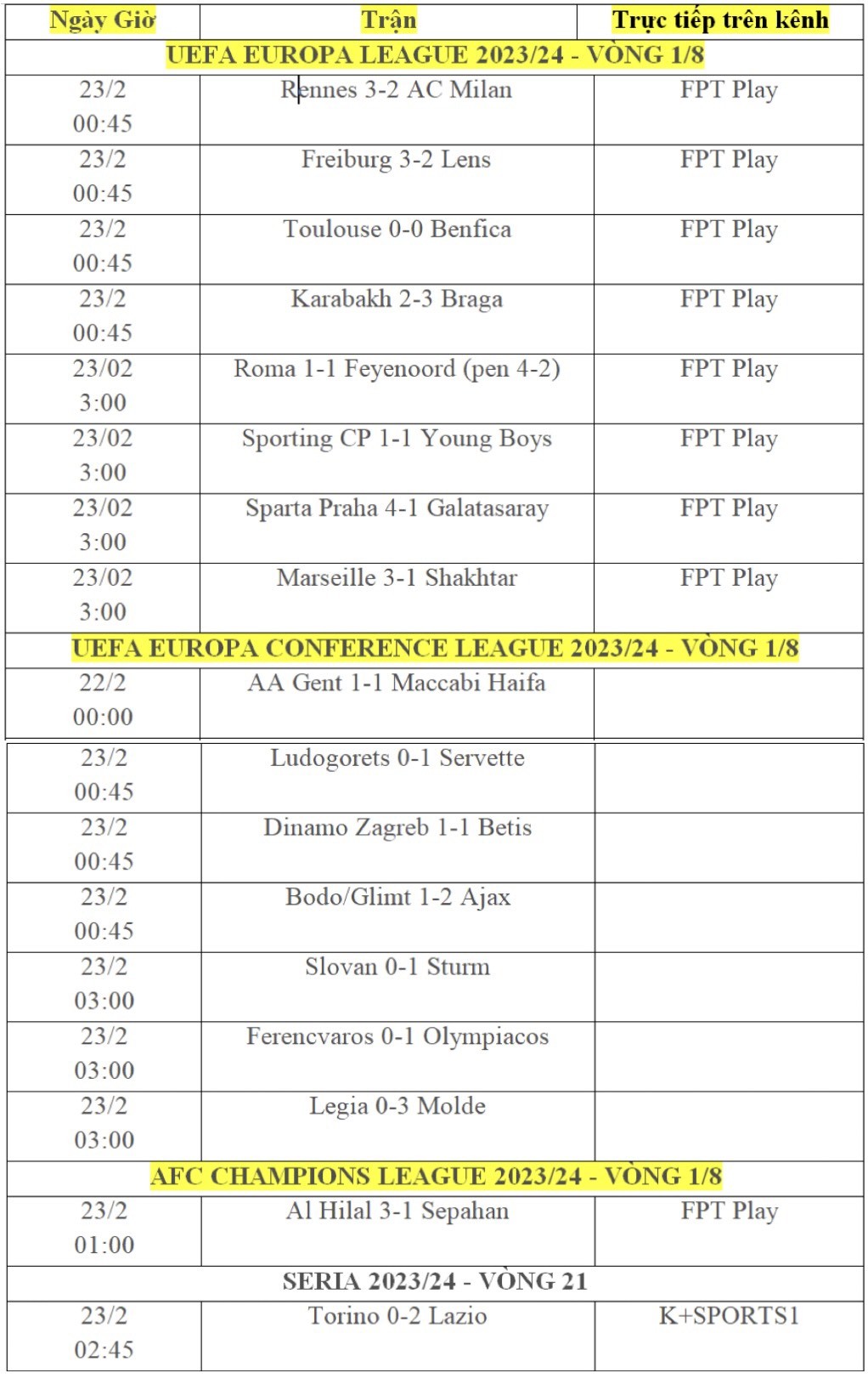 | Kết quả bóng đá của các trận đấu trên sân cỏ châu Âu, châu Á ngày 22/2, rạng sáng ngày 23/2. |