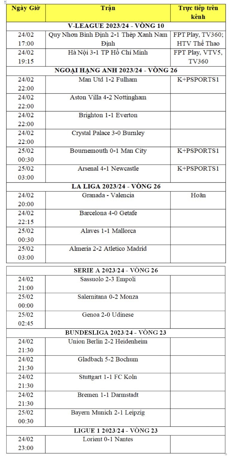 | Kết quả bóng đá của các trận đấu trên sân cỏ châu Âu, châu Á ngày 24/2, rạng sáng ngày 25/2 |