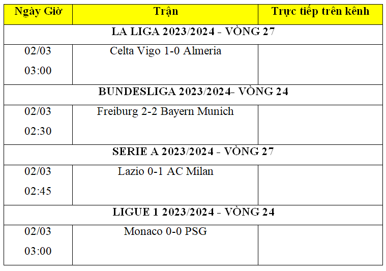 | Kết quả bóng đá của các trận đấu trên sân cỏ châu Âu rạng sáng ngày 2/3. |