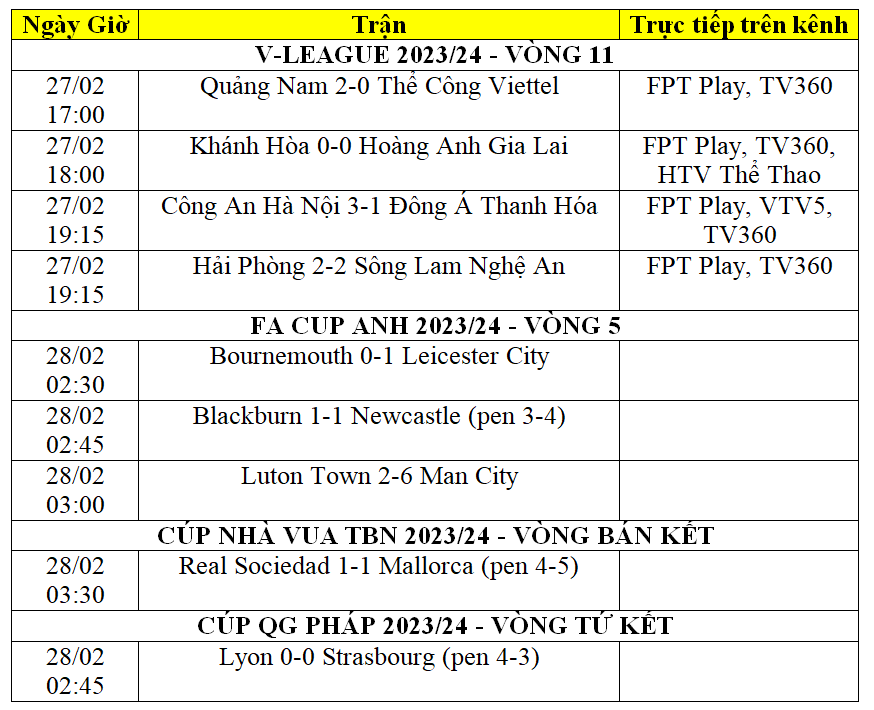 | Kết quả bóng đá của các trận đấu trên sân cỏ châu Âu, châu Á ngày 27/2, rạng sáng ngày 28/2. |