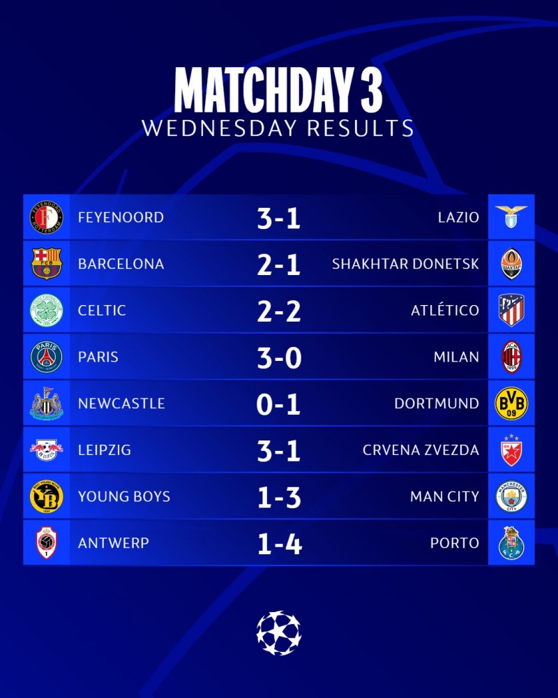 Sau loạt trận này, tại bảng F, PSG leo lên ngôi đầu bảng F với 6 điểm; Dortmund leo lên vị trí thứ nhì với 4 điểm; Newcastle tụt xuống hạng 3 bảng với 4 điểm (thua đối đầu Dortmund); còn AC Milan tụt xuống cuối bảng 2 điểm.
