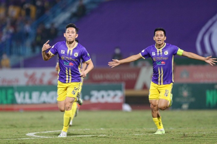 | Hai Long (bên trái) mở tỉ số cho đội chủ sân Hàng Đẫy |