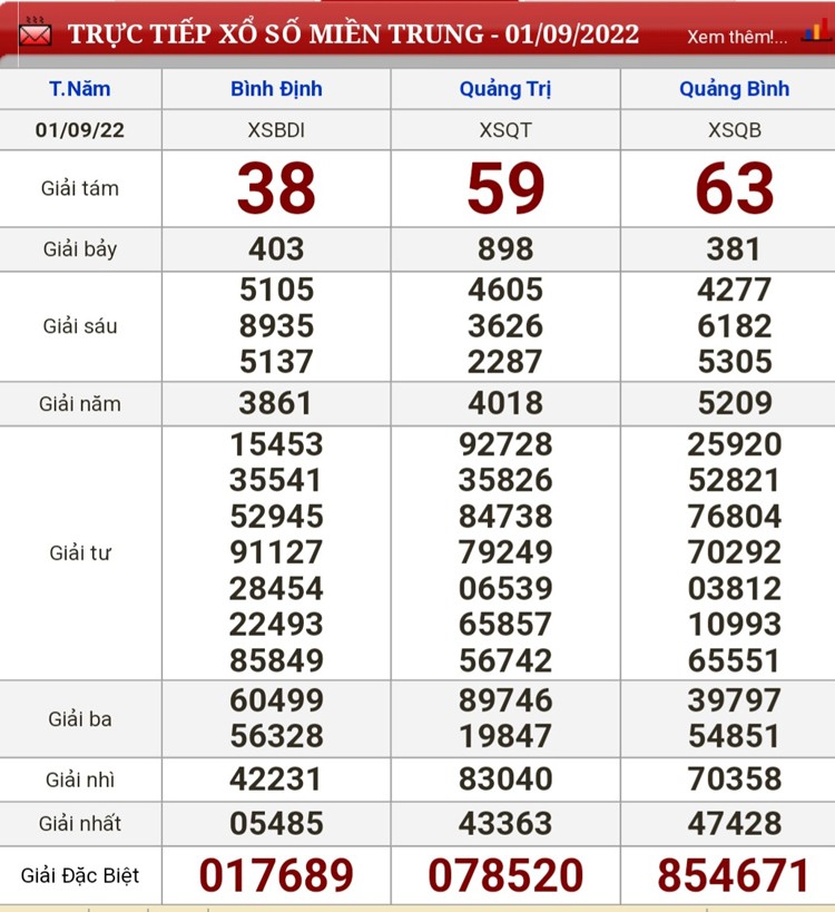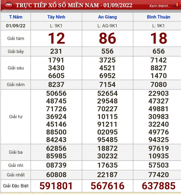 Kết quả xổ số hôm nay ngày 1/9 vừa được các Công ty Xổ số kiến thiết tại khu vực miền Nam công bố như: Tây Ninh, An Giang, Bình Thuận và các Công ty Xổ số khu vực miền Trung như: Bình Định, Quảng Trị, Quảng Bình, và Công ty Xổ số kiến thiết Miền Bắc công bố.