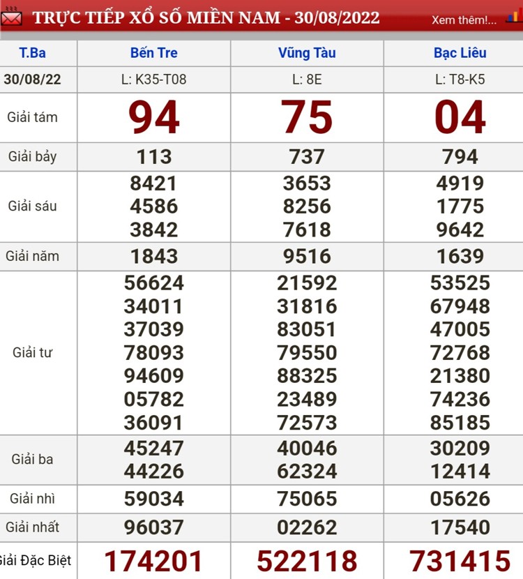 Kết quả xổ số hôm nay ngày 30/8 vừa được các Công ty Xổ số kiến thiết tại khu vực miền Nam công bố như: Bến Tre, Vũng Tàu, Bạc Liêu; và các Công ty Xổ số khu vực miền Trung như: Đắk Lắk, Quảng Nam và Công ty Xổ số kiến thiết Miền Bắc công bố.