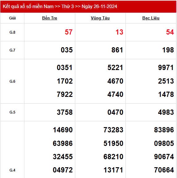 • Thứ 3: xổ số Vũng Tàu (XSVT), xổ số Bến Tre (XSBTR), xổ số Bạc Liêu (XSBL)