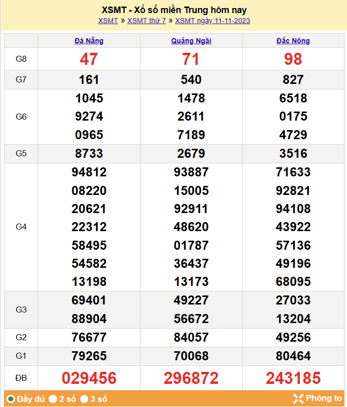 • Thứ 7: xổ số Đà Nẵng (XSDNA), xổ số Quảng Ngãi (XSQNG), xổ số Đắk Nông (XSDNO).