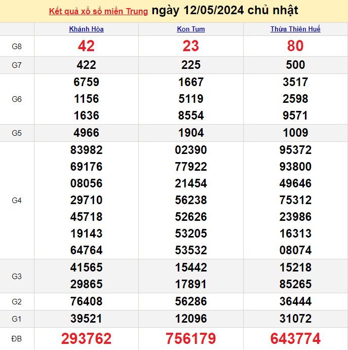 • Chủ nhật: xổ số Kon Tum (XSKT), xổ số Khánh Hòa (XSKH), xổ số Thừa Thiên Huế (XSTTH).