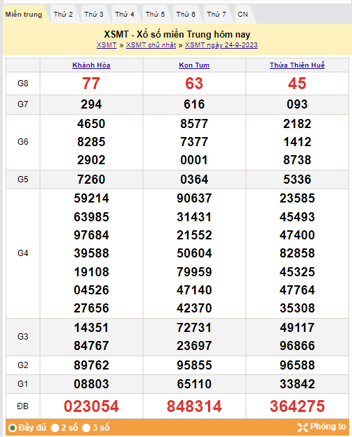 • Chủ nhật: xổ số Kon Tum (XSKT), xổ số Khánh Hòa (XSKH), xổ số Thừa Thiên Huế (XSTTH).