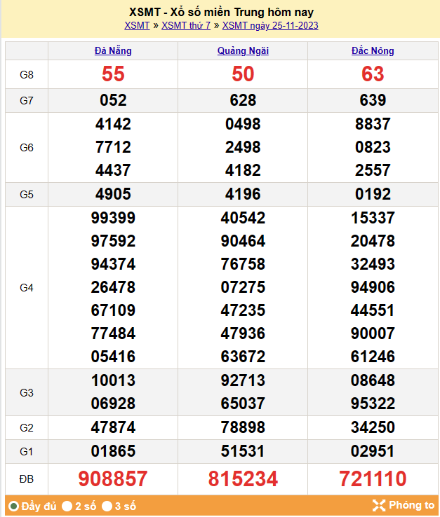 • Thứ 7: xổ số Đà Nẵng (XSDNA), xổ số Quảng Ngãi (XSQNG), xổ số Đắk Nông (XSDNO).