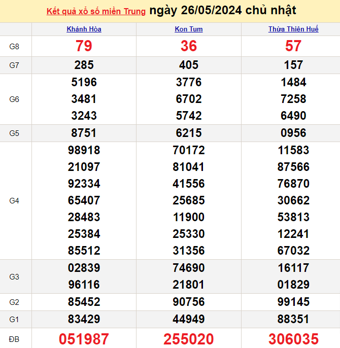 Kết quả xổ số miền Trung gồm các tỉnh thành: Xổ số Đà Nẵng, xổ số Quảng Ngãi, xổ số Đắk Nông, xổ số Bình Định, xổ số Đắk Lắk, xổ số Gia Lai, xổ số Khánh Hoà, xổ số Phú Yên, xổ số Bình Thuận, xổ số Thừa Thiên - Huế, xổ số Kon Tum, xổ số Quảng Trị, xổ số Ninh Thuận...