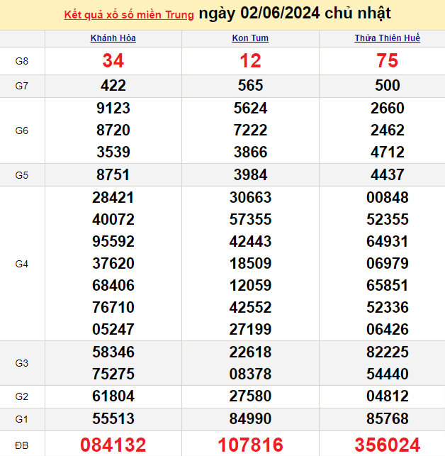 • Chủ nhật: xổ số Kon Tum (XSKT), xổ số Khánh Hòa (XSKH), xổ số Thừa Thiên Huế (XSTTH).