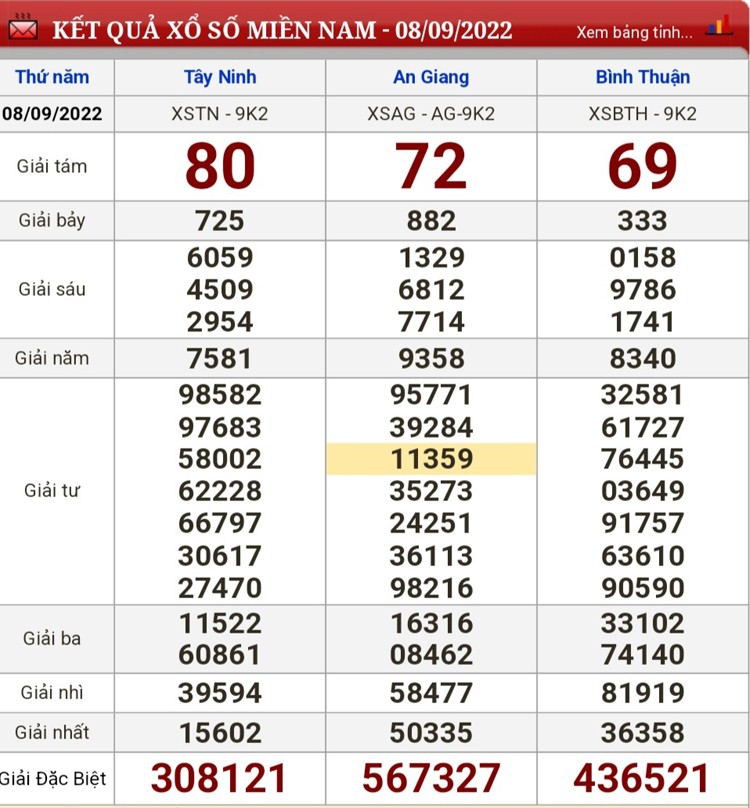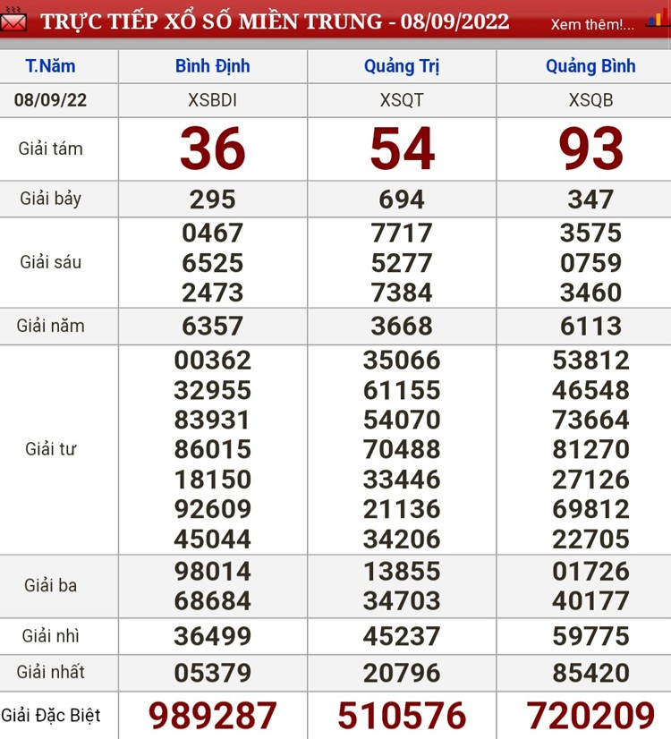 Kết quả xổ số hôm nay ngày 8/9 vừa được các Công ty Xổ số kiến thiết tại khu vực miền Nam công bố như: Tây Ninh, An Giang, Bình Thuận, và các Công ty Xổ số khu vực miền Trung như: Bình Định, Quảng Trị, Quảng Bình, và Công ty Xổ số kiến thiết Miền Bắc công bố.