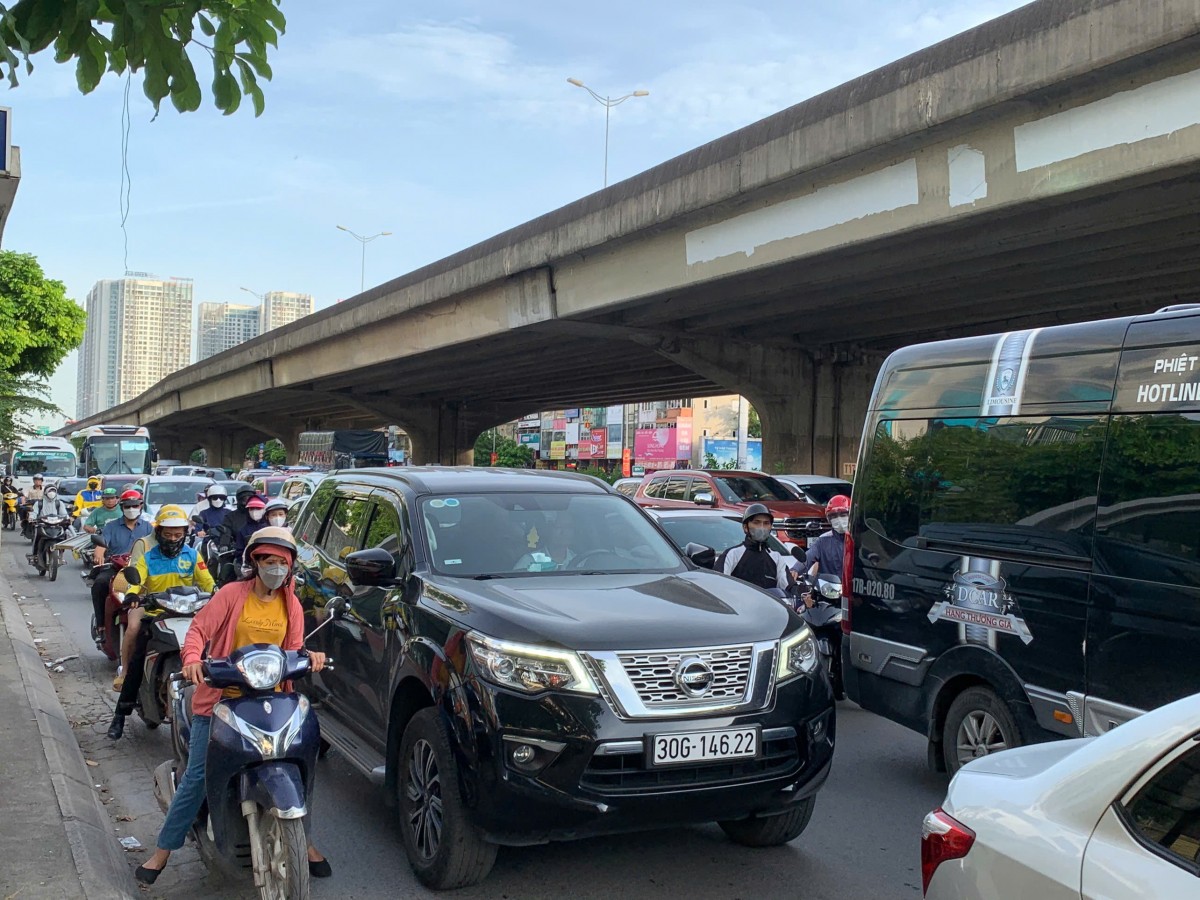 | Ghi nhận tại thời điểm 17h30' tại khu vực Ngã Tư Sở, đoạn Vành đai 2 xuống, lượng phương tiện, đặc biệt là xe ô tô đã kéo hàng dài. Ảnh: Thanh Minh |
