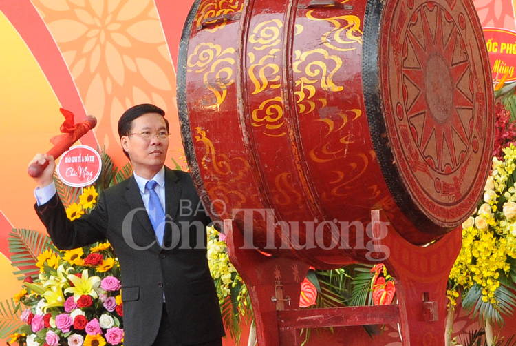 | Ủy viên Bộ Chính trị, Trưởng Ban Tuyên giáo Trung ương Võ Văn Thưởng đánh trống khai mạc hội báo |