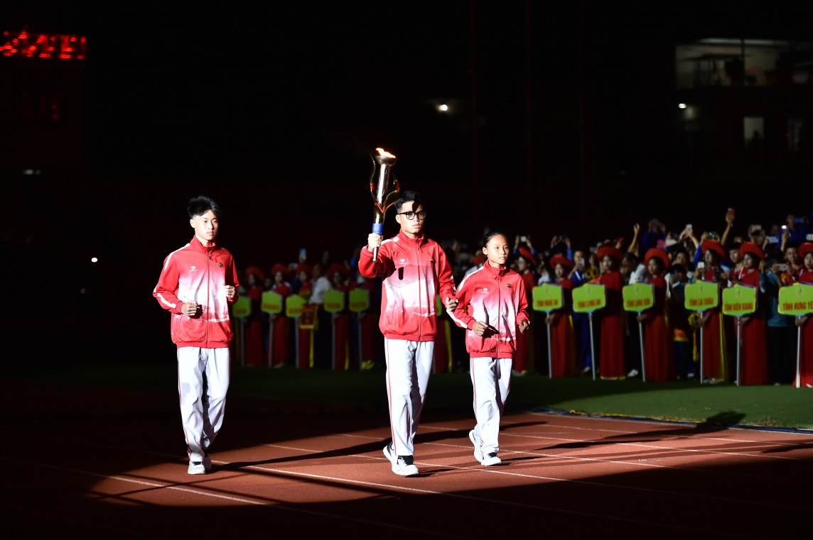 | Phó Thủ tướng Chính phủ Lê Thành Long, Thứ trưởng Bộ Giáo dục và Đào tạo Nguyễn Thị Kim Chi và Chủ tịch UBND TP. Hải Phòng trao lửa Phù Đổng tại lễ khai mạc. |