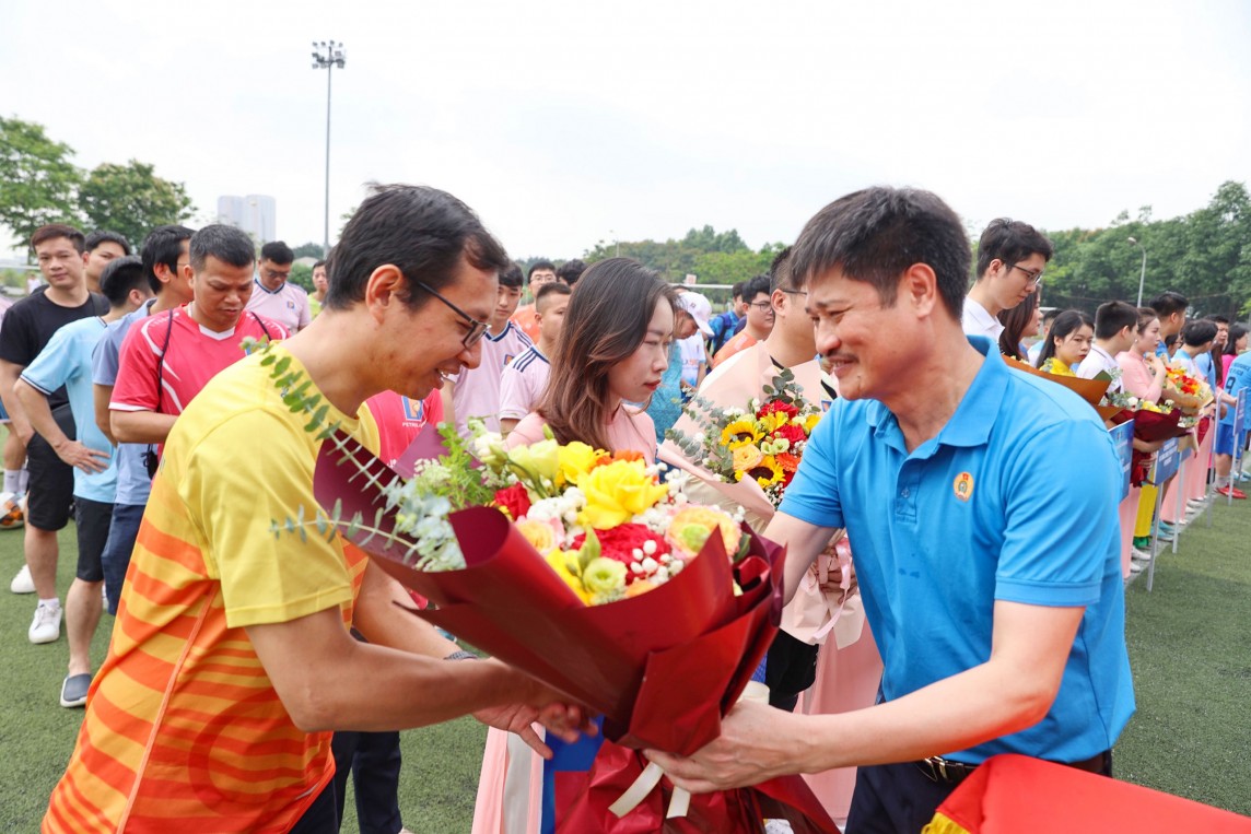 | Ông Nguyễn Thanh Sơn - Ủy viên BTV Công đoàn Công Thương Việt Nam, Ủy viên BTV Đảng ủy, Chủ tịch Công đoàn Xăng dầu Việt Nam tặng hoa và cờ lưu niệm các đoàn tham dự Hội thao |