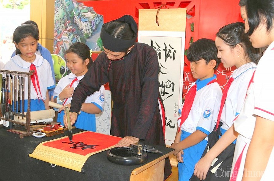 Theo ghi nhân của phóng viên tại Trường Tiểu học Nguyễn Thái Sơn, các em học sinh rất thích thú khi hòa mình vào không gian triển lãm, được trải nghiệm viết thư pháp, lăn mực tàu, nghe giới thiệu về lịch sử hình thành Văn Miếu - Quốc Tử Giám, trải nghiệm các trò chơi trí tuệ, thú vị, bổ ích như “cụ rùa” bằng công nghệ trí tuệ nhân tạo (AI), thế giới ảo giới thiệu về Văn Miếu - Quốc Tử Giám, những hình ảnh trực quan về những người sáng lập ra Văn Miếu - Quốc Tử Giám, tương tác với thầy đồ…