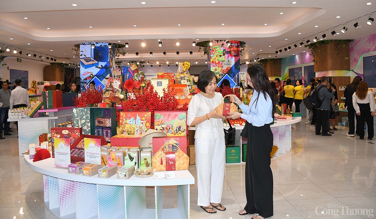 Đặc biệt, tại khu vực trung tâm, khách tham quan có thể chiêm ngưỡng những sản phẩm đặc trưng ngày Tết, các gói quà tràn đầy ý nghĩa. Đối diện khu vực trung tâm, màn hình LED trình chiếu những thương hiệu nổi bật, giúp khách tham quan, đối tác, nhà mua hàng quốc tế dễ dàng tiếp cận thông tin, hình ảnh sản phẩm tiêu biểu. Quy mô và cách thức trưng bày nhằm tạo ra một không gian mở để doanh nghiệp dễ dàng giao lưu và trao đổi kinh nghiệm.