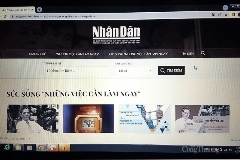 Trang thông tin đặc biệt Tổng Bí thư Nguyễn Văn Linh tại địa chỉ http://nguyenvanlinh.nhandan.vngồm 2 chuyên mục chính: “Những việc cần làm ngay” và “Sức sống những việc cần làm ngay”. Trên nền tảng công nghệ hiện đại, thiết kế trang trọng, trực quan, chuyên mục “Những việc cần làm ngay” đã số hóa kho tư liệu đặc biệt với 31 bài báo của đồng chí Nguyễn Văn Linh đăng trên Báo Nhân Dân trong chuyên mục Những việc cần làm ngay (số đầu tiên 25/5/1987, số cuối cùng ngày 28/9/1990).