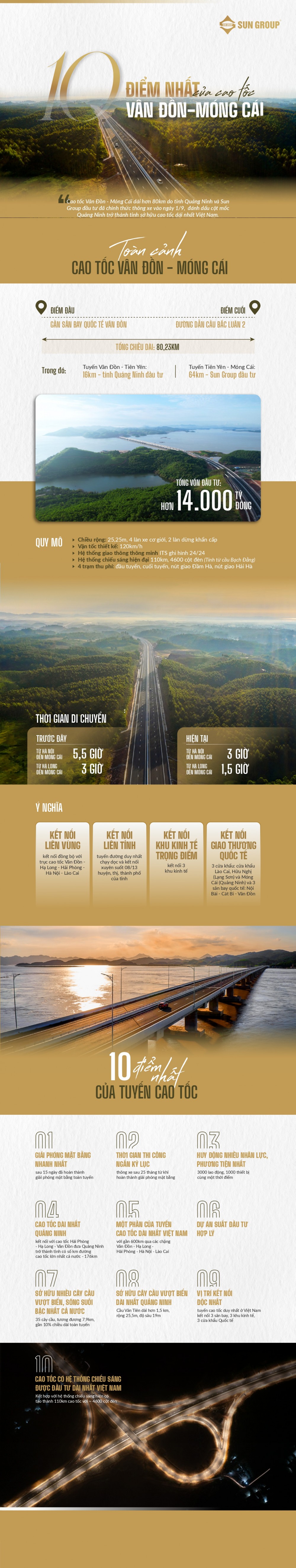 Cao tốc Vân Đồn - Móng Cái dài hơn 80km do tỉnh Quảng NinhSun Group đầu tư đánh dấu cột mốc Quảng Ninh trở thành địa phương sở hữu cao tốc dài nhất Việt Nam.