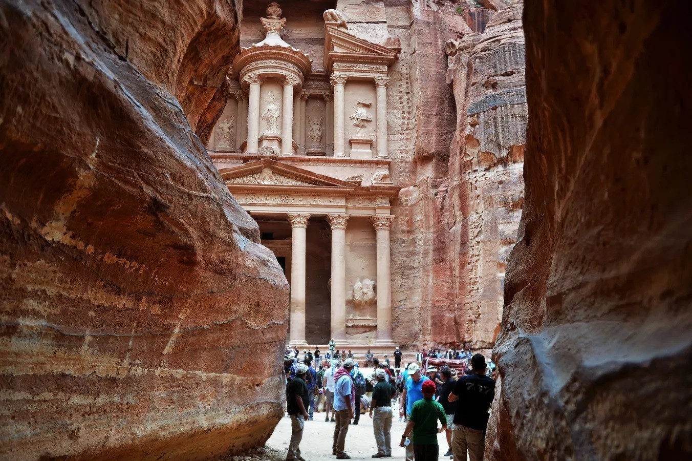 | Khách du lịch đến thăm ngôi đền-lăng đá El-Hazne trong thành phố cổ Petra ở Jordan. Ảnh: Sputnik |