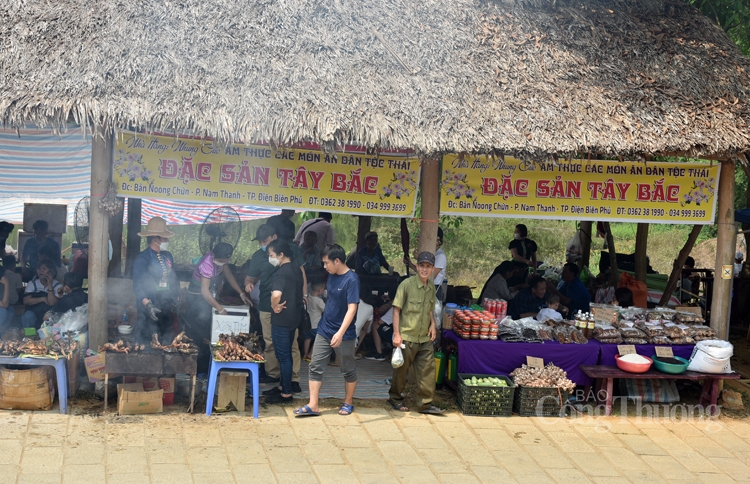 Bên cạnh đó là 10 gian nhà lá giới thiệu ẩm thực truyền thống dân tộc: Gà ri, lợn mán, các loại rau rừng… và khoảng 7 gian hàng nước phục vụ nhu cầu khách tham quan không gian chợ. Hàng hóa tại phiên chợ đến tay người tiêu dùng là những sản vật, thực phẩm đều đảm bảo chất lượng và vệ sinh an toàn thực phẩm.