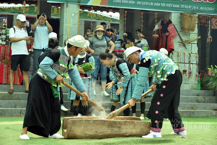| Trình diễn thêu thổ cẩm và giã bánh dày tại phiên chợ |