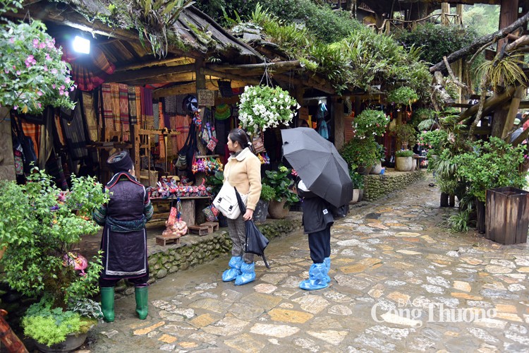 Bước qua cổng bản Cát Cát, du khách được rảo bước trên những con đường được lát đá siêu đẹp. Dọc hai bên đường la liệt những hàng quán bán đồ thổ cẩm lưu niệm. Những câu mời khách đơn sơ, mộc mạc của đồng bào dân tộc Mông để lại ấn tượng cho du khách. Hàng hóa ở đây chủ yếu là của đồng bào sản xuất và chế biến. Trong đó các sản phẩm làm ra từ thổ cẩm như: Quần áo, khăn, chăn, mũ, túi, ví… trông vô cùng đặc sắc và nổi bật nhờ có các hoa văn và họa tiết thổ cẩm.