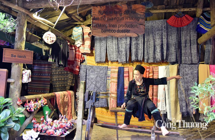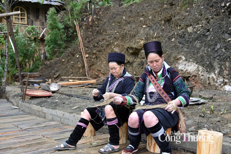 Tìm hiểu về quá trình dệt vải của đồng bào Mông bản Cát Cát, du khách sẽ thấy được sự kỳ công làm ra những tấm thổ cẩm này. Cây gai dầu, cây bông và vải lanh được lấy từ rừng và sử dụng may thành những bộ trang phục, còn lụa từ tằm được dùng thêu. Để tạo ra màu sắc cho các bộ trang phục thì màu vàng được lấy từ nghệ, màu đen từ lá rừng, màu đỏ và nâu từ vỏ cây, và màu xanh từ lá chàm tạo nên màu sắc trông rất bắt mắt. Khi đi tham quan những ngôi nhà của đồng bào Mông, du khách dễ dàng bắt gặp hình ảnh các bà, mẹ dân tộc Mông ngồi bên khung cửi, tay thoăn thoắt đưa thoi, dệt lên những tấm vài đầy màu sắc.