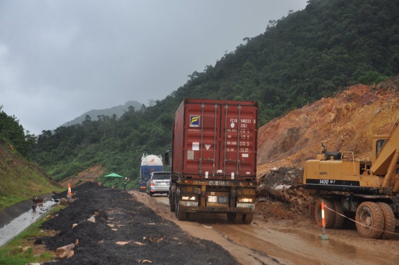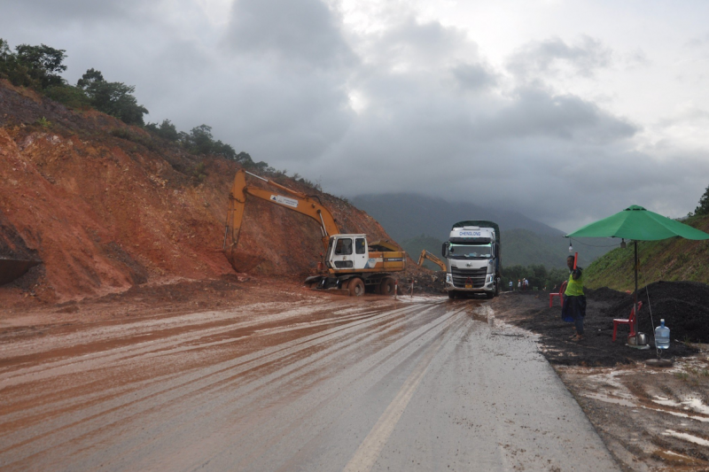 | Sau khi nhận thông tin sạt lở, Khu Quản lý đường bộ III (Cục Đường bộ Việt Nam) đã chỉ đạo đơn vị quản lý bảo trì bố trí công nhân, điều động máy móc để dọn dẹp đất đá, thông tuyến |