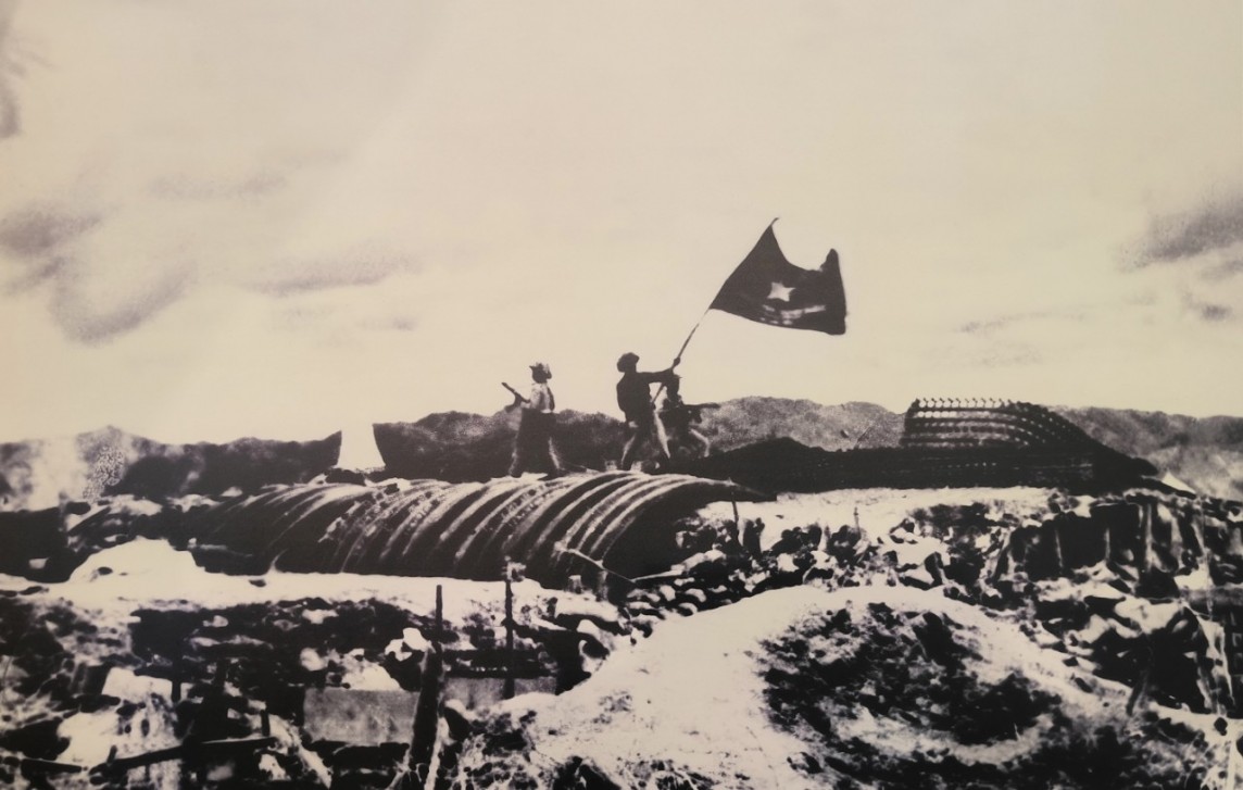 | Lá cờ Quyết chiến, quyết thắng tung bay trên nóc hầm tướng Christian de Castries, chỉ huy quân Pháp tại tập đoàn cứ điểm Điện Biên Phủ. Ảnh: Triệu Đại. |